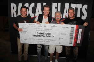 Rascal Flatts celebrated a major milestone of 10 million tickets sold this past weekend in Hartford, CT. The group was presented with a commemorative ticket at their show on Saturday night (8/13) to recognize the occasion.